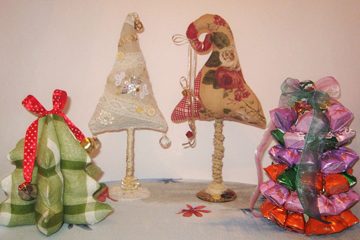 Четыре ёлочки выполнены в подарок родным и близким в разных стилях: винтаж, тильда и конфетная. Такие рукодельные ёлочки придутся по вкусу каждому.