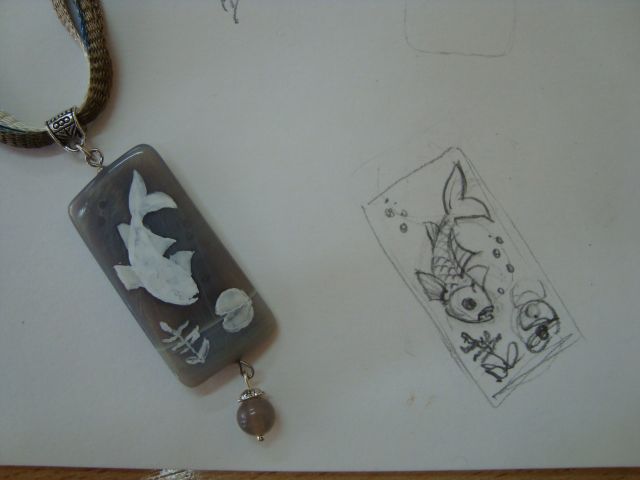 Кулон «Рыбка». Агат, яичная темпера, акварель, лак.