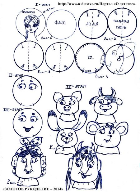 Таим образом, используя одну основу, вы можете получить различные персонажи, меняя только формы ушей, щёчек, носов, оформляя шляпками, косынками, париками и т.д. (рис. 1).