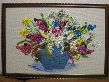 Цветы в работе выглядят очень естественно, как живые. Невольно думаешь про лето. Этапы работы описаны. Жаль только, что нет фото хотя бы нескольких стежков для образца. Очень интересно, как они выполняются. Удачи вам в конкурсе!