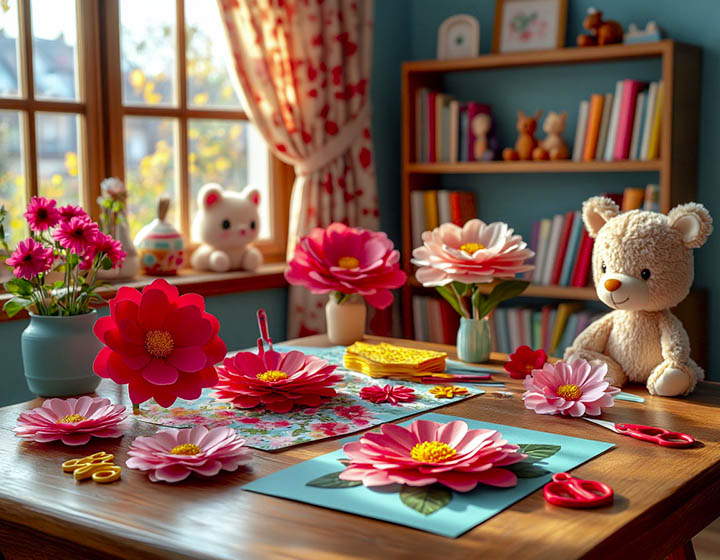 Такие цветы можно делать разных размеров и цветов, создавая целые букеты на поверхности открытки. Дополните композицию бабочками, вырезанными из яркой бумаги, или блестками для праздничного эффекта.