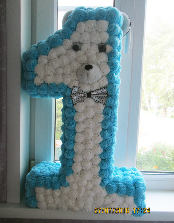 Единица сделана из цветов, которые изготовлены из салфеток; нос, уши, глаза от старой мягкой игрушки.