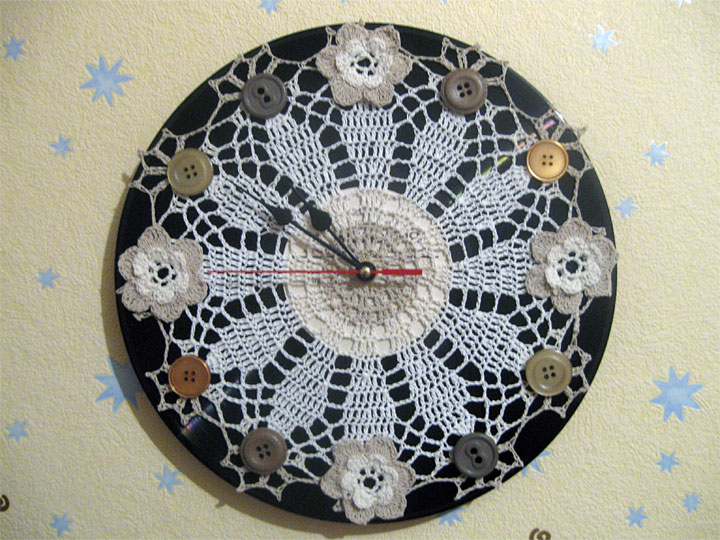 Часы выполнены в винтажном стиле. Основание сделано из виниловой пластинки, циферблат – из вязаной салфетки и пуговиц.