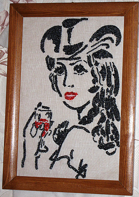 В прошлом году я увидела рисунок девушки с бокалом, это был набросок. Возникла идея вышить картину бисером.