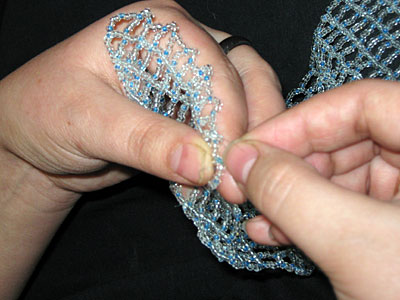 2. Выполняется «пояс» из бисера. Могут быть использованы разные техники: 1) вертикальные ряды и работу держат постоянно в руках; 2) техника ткачество, пояс получается более плотным и обе руки свободно работают.