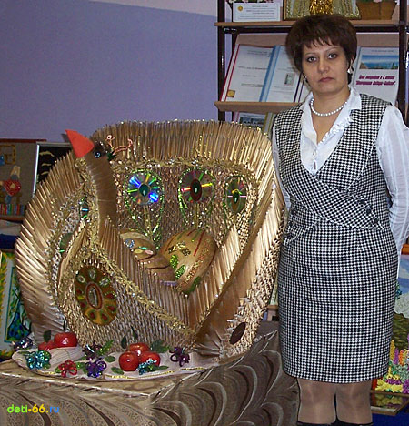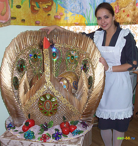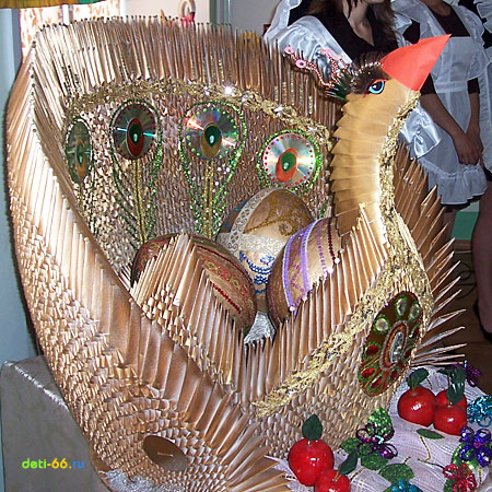 Знакомая райская птичка! Помню-помню, сколько труда было в неё вложено. По-моему, не было ни одного равнодушного человека во всём лицее, когда шёл процесс изготовления "этакого чуда". Ну, ждали чего-то необычного, но чтоб такое собрать из обычных "бумажек"!!!! Это дар! И Вы, Мария Алексеевна, умело им пользуетесь! Удачи в конкурсе!!!!!!