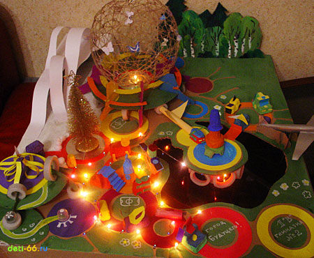 Замечательный город-мечта! И каток, и горки, и елочка, и футбольное поле, и озеро с байдарками! Все самое интересное и любимое детьми! Малыши - молодцы, ничего не забыли из своих любимых развлечений! Но и про учебу подумали, школу тоже построили в своем городе! А какие славные маленькие жители! Жалко, что на фотографии не разглядеть их всех, очень любопытно! И как все светится огоньками! Умнички-детки! Вспомнилась детская картонная карусель, которую мне папа смастерил сам в моем 1 классе. Вот радости-то было от одной карусели! А тут столько всего! Спасибо, что на несколько минут вернули меня в детство! Фотографию этого макета нужно послать в фирмы, изготавливающие детские конструкторы!