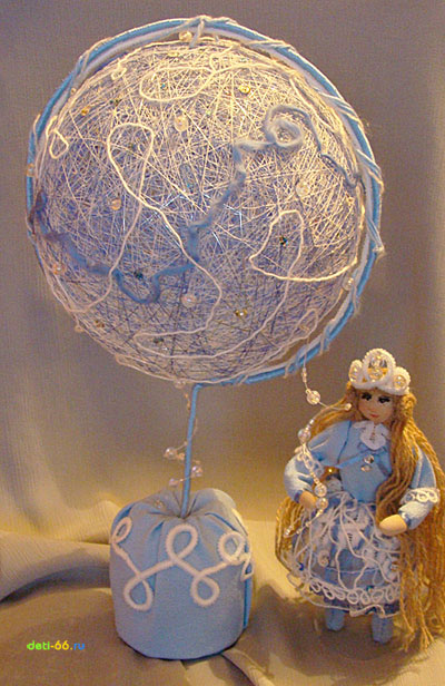 В руке у куклы волшебная палочка, от которой разлетаются воздушные шарики, в качестве которых использованы прозрачные перламутровые бусины. Воздушные шары летят к Планете Мыльных пузырей, с которой прилетела волшебница. Планета изготовлена из ниток.