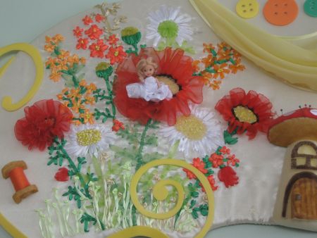 7. Вышивку дополнила «Дюймовочкой». Наряд для неё сшила из белого атласа.