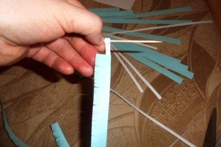 6. Начинаем наматывать на зубочистку с узкой полоски. При переходе на бахромчатую полоску продолжаем наматывать, одновременно промазываем клеем, иначе цветок может размотаться, и не забываем про «хвостик»: его тоже нужно намазать клеем.