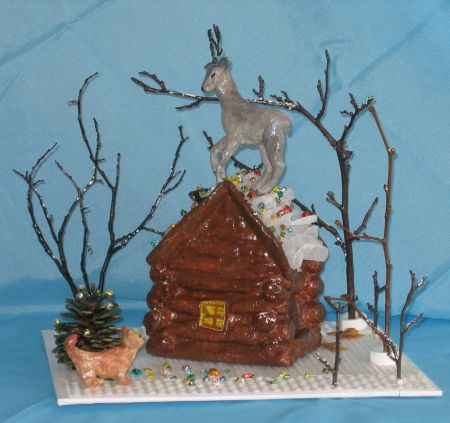 13. Для композиции «Серебряное копытце», чтобы изобразить лес, используем ветки яблони или липы, шишки. Ветки чуть-чуть покрасить белой гуашью. А крышу дома укрываем белой обёрточной бумагой.