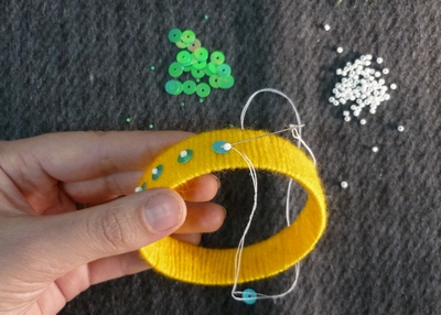4. Украсить браслет пайетками, бисером, пуговицами, лентами.