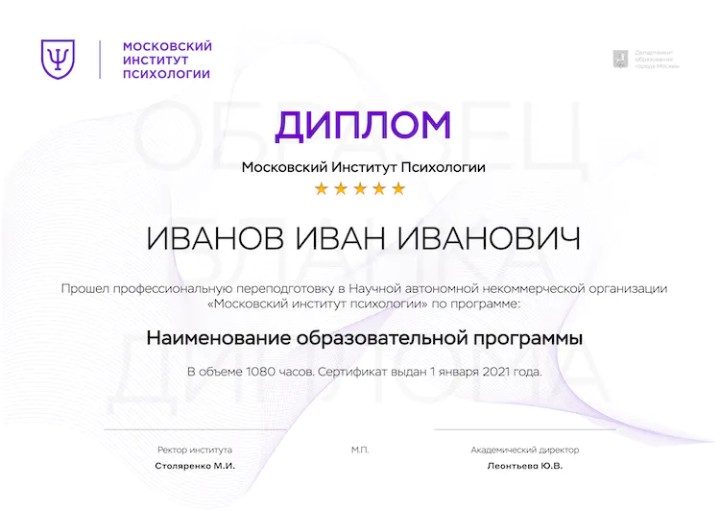 Один из удобных вариантов – переподготовка в Московском институте психологии, в онлайн-институте психологии. Обучение доступно слушателям с законченным высшим или средним профессиональным образованием. Институт обеспечивает качество обучения, благодаря опыту создания актуальных программ. Учебное заведение выбирает экспертов – преподавателями курсов становятся психологи, которые применяют знания на практике.