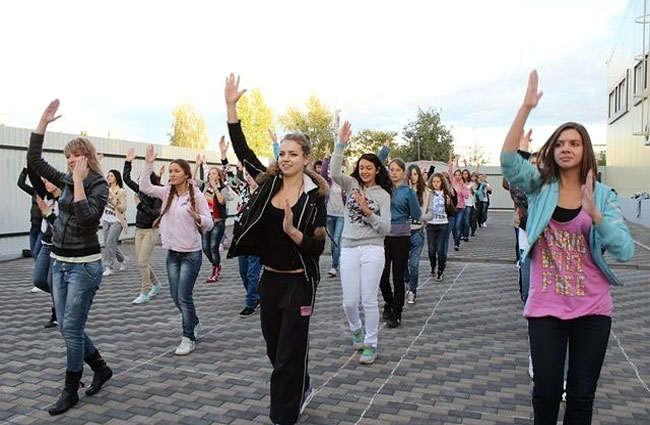 На самой большой перемене на школьном дворе устройте настоящий флешмоб. Разбейтесь по парам и ходите с учебниками. А затем устройте шоу. Одновременно начните танцевать под известную школьную песню (гимн школы, если есть). Движения должны быть не сложными и запоминающимися.