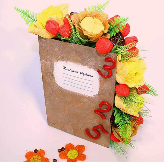 В букете не обязательно должны быть цветы: в нём могут быть конфеты, игрушки. А самым запоминающимся уж точно станет букет из канцелярских товаров: скрепок и карандашей. Или, например, букет – классный журнал.
