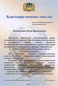 Ольга Васильевна! Я восхищена Вами! Ежедневно работая с классом, успеваете разрабатывать и печатать методические пособия, да ещё в таком количестве!!! Об успешности Вашей педагогической деятельности говорит результативность внеклассной работы по предметам и, конечно, сроки из детских сочинений. Дети Вас любят и ценят, а это дорогого стоит! С наилучшими пожеланиями Рашида Дикабристовна.