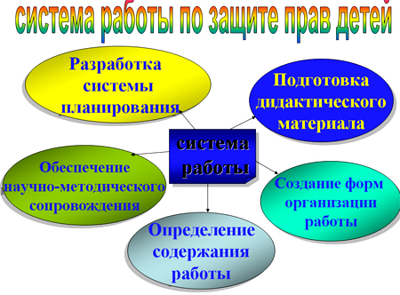 Циклы занятий направлены на формирование личного отношения детей к возможным ситуациям нарушения их прав и адекватных способов поведений в них. Тематика занятий учитывает основные положения Декларации прав ребёнка, Конвенции о правах ребёнка. Совместные виды деятельности с детьми строятся с учётом дифференцированного подхода и включают в себя ролевые, театрализованные, дидактические игры, например: «Семейный совет», «Дружная семья», «Я имею право», « Я не должен», « Скорая помощь», « Если чужой стучится в дверь».