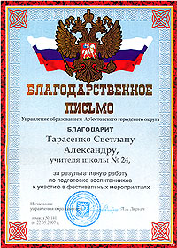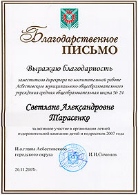 Для меня примером для подражания, настоящим учителем является моя мама. Ее зовут Светлана Александровна Тарасенко. Она работает учителем русского языка и литературы в МОУ СОШ № 24 города Асбеста уже 21 год.