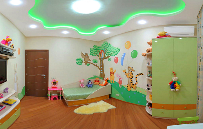 Многоуровневые системы в детских комнатах используются не очень часто. Но если в доме высокие потолки, можно оформить их в виде купола, других сложных дизайнерских конструкций. Выбор дизайна зависит и от возраста ребенка.