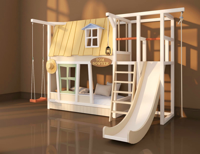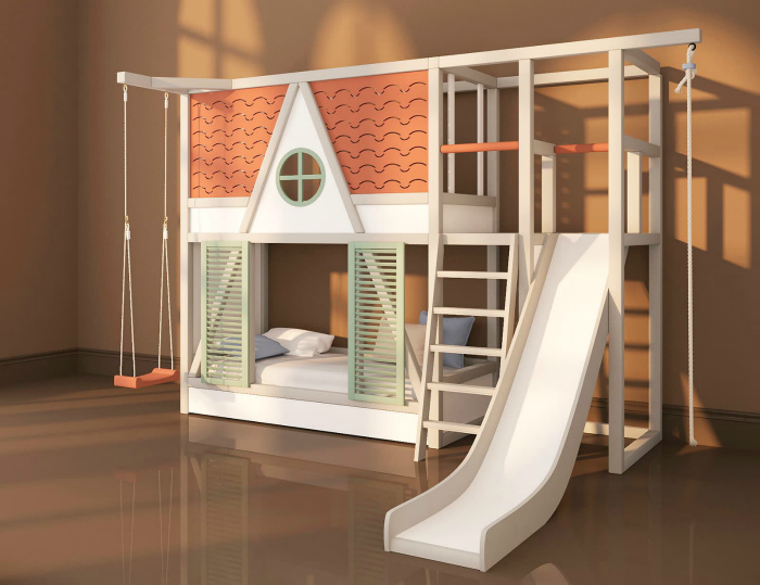 2. Кровать выполнена в виде двухэтажного домика с открывающимися окнами и крышей.