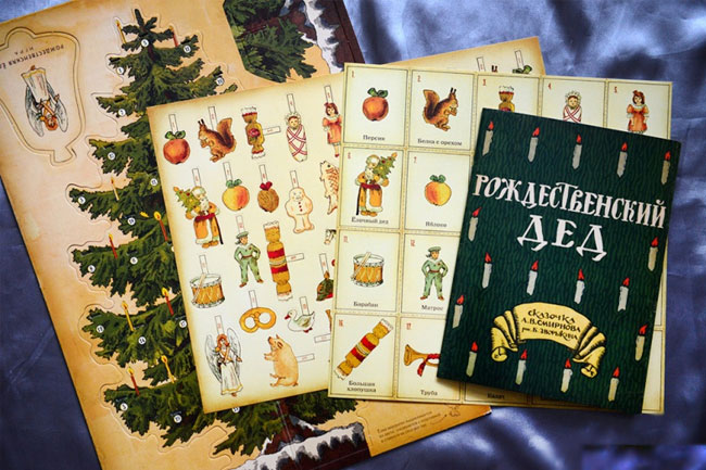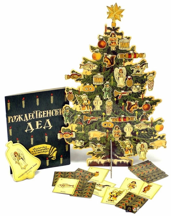 В роскошном картонном конверте с прозрачным окошком скрывается большая модель елки из необычайно прочного толстого лакированного картона, лист с фигурками для украшения этой елки, лото «Рождественская елка», а также книжка «Рождественский дед» – сказка в стихах, проиллюстрированная самим Б. В. Зворыкиным.