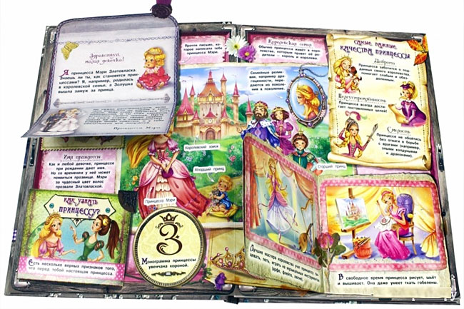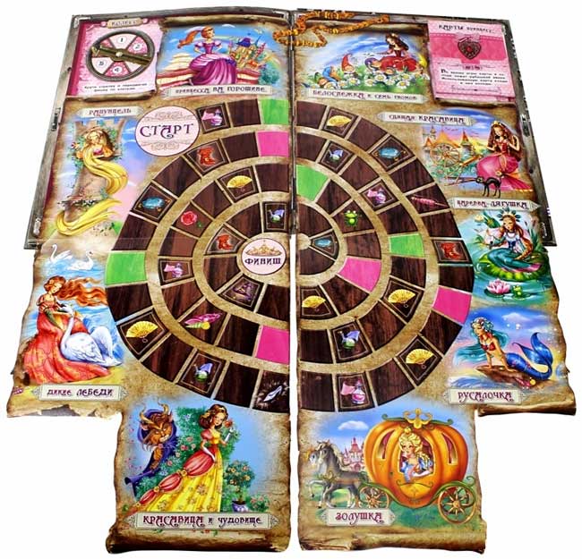 Также в книге – письмо и сертификат от принцессы Мэри Златовласки, объёмный королевский замок, раскрывающиеся медальоны и шкатулки, настольная игра «Сказочный мир» с картами и раскладным игровым полем.