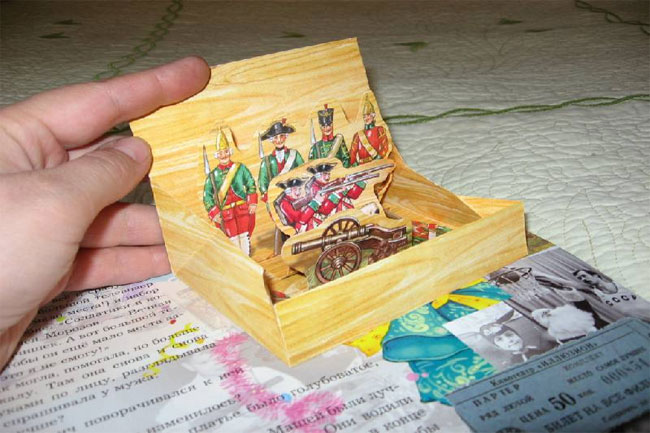 Здесь можно найти и «настоящий» билет на кремлевскую елку, и календарь, и странички дореволюционного журнала, а великолепные открытки начала XX века, хранящиеся в конверте на форзаце, даже можно кому-нибудь подарить.