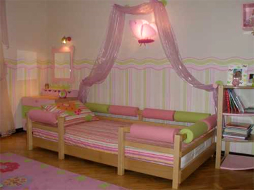 Кровать. Заранее подумайте о конструкции и степени жесткости матраса. Увы, дети обожают прыгать на ней, поэтому от пружинной основы лучше отказаться. Хороши безопасные «дышащие» матрасы с чередованием слоев из прессованной целлюлозы, пенополиуретана и латекса. На мягком матрасе спать уютнее, зато жесткий полезнее для осанки. Если у ребенка склонность к сколиозу, выбирайте максимальную степень жесткости.