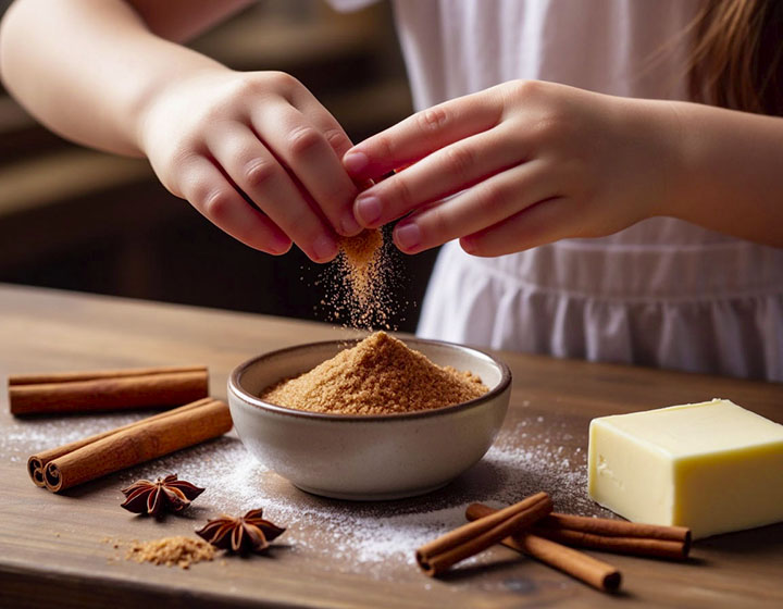 Смешайте в мисочке сахар и корицу. Объявите, что это «золотая пыльца» или «коричная магия». Пусть ребенок щедро посыплет ею весь пласт, создавая «сладкую бурю». Здесь можно творить от души!