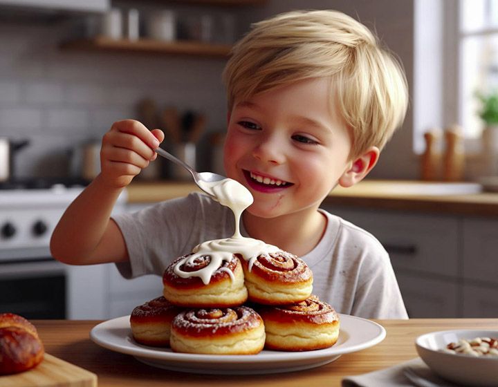 Приготовьте глазурь: просто смешайте мягкий сыр, сахарную пудру и ваниль. А вот наносить ее на теплые синнабоны – почетная миссия для шефа. Пусть ребенок с упоением размазывает эту белоснежную шапку. Это самый сладкий штрих.