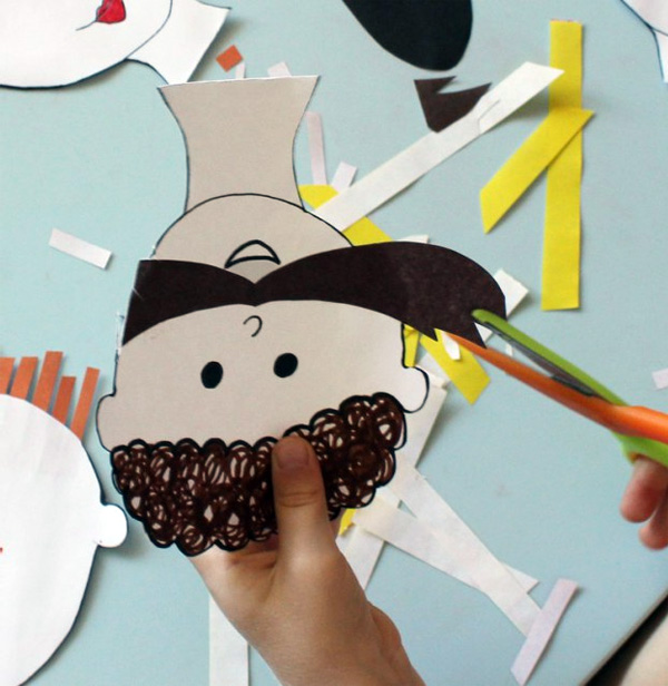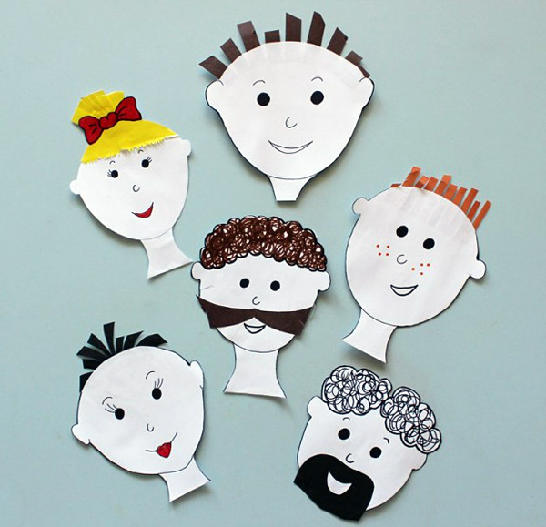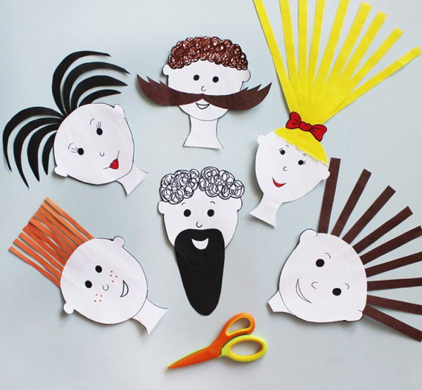 Для начала делаем заготовки. Это будут лица людей. Нарисуйте лицо человека, вырежьте его. Можно из картона, тогда эти лица не будут одноразовые в использовании. А теперь ваша фантазия вам поможет! Нужно приклеить им прическу, усы или бороду. На фотографии ниже увидите несколько идей таких причесок. Вот и заготовка готова!