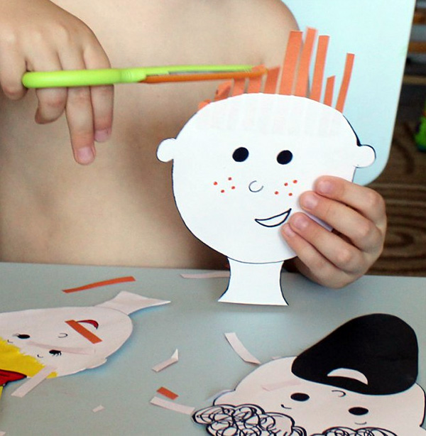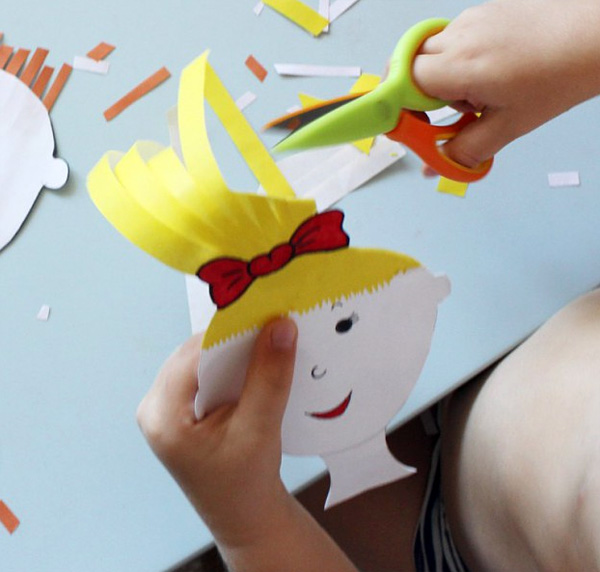 Вот какие все с прическами, довольные. А самое главное, ребенок не просто сидел и нарезал полосочки, что для некоторых деток — очень скучное занятие, а поиграл в ролевую игру (особенно, если вы будете разговаривать за этих «клиентов», а малыш будет отвечать вам).