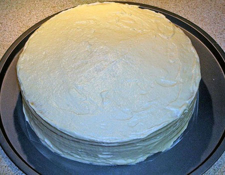Каждый корж смажьте остуженным кремом, укладывая их стопочкой. Промажьте края и верх тортика.