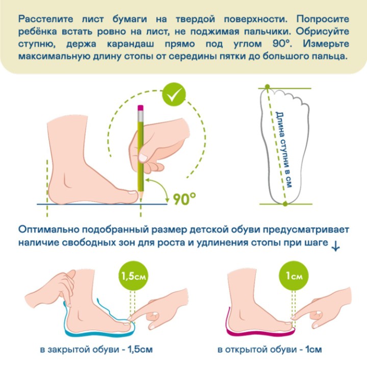 Давайте начнем с самого важного – размера. Тут есть один простой секрет: между носком ботинка и большим пальчиком должен помещаться ваш мизинец (это примерно 10-15 мм). Измеряйте длину стопы ребёнка каждые три месяца, так как дети быстро растут. Обратите внимание на ширину детской обуви: слишком узкая обувь может сдавливать ногу, вызывая дискомфорт и проблемы с кровообращением. И вот вам лайфхак от опытной мамы: никогда не покупайте обувь ребенку утром! К вечеру ножка немного отекает и становится больше, поэтому примерку лучше устраивать во второй половине дня.