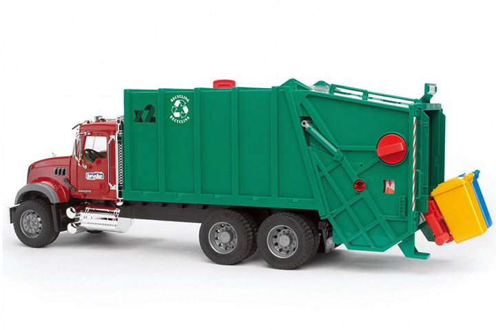 Все происходит абсолютно так, как и в настоящей машине этого вида. Кстати, мусоровоз Bruder можно купить разных марок, ведь настоящую служебную технику для уборки производит несколько заводов: