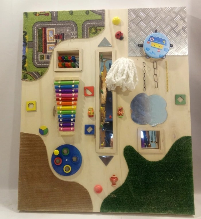 развивающих панелей с фрагментами, издающими вибрации, звуки, свет, с участками разной фактуры, формы и цвета. Такие универсальные игрушки стимулируют все органы чувств малышей;