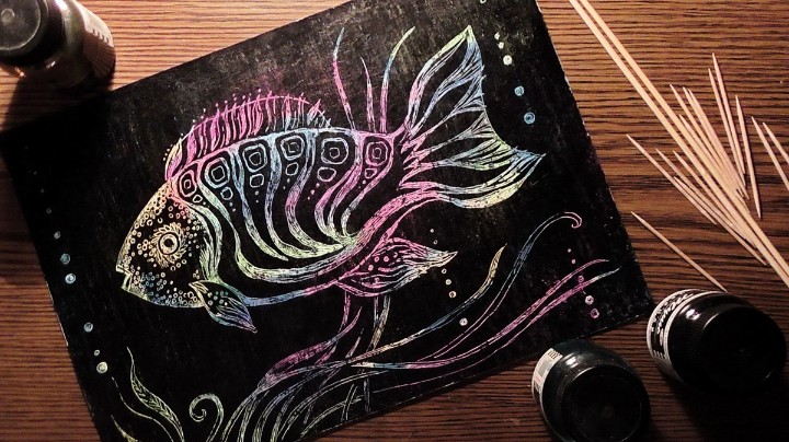 Граттаж превращает процесс рисования в захватывающее открытие. Вначале лист покрывается восковыми мелками. Затем наносится слой краски, который закрывает первоначальный рисунок. С помощью острых предметов, например, зубочисток, верхний слой соскабливается, раскрывая яркие цвета нижнего. Этот процесс не только улучшает мелкую моторику, но и позволяет исследовать эффекты комбинирования цветов и текстур.