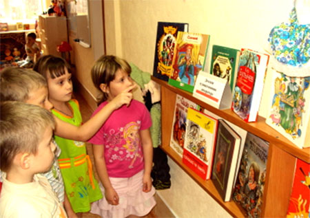 Оформление группы в стиле «Библиотека», листы бумаги со схематичным изображением обложки книги, карандаши, изображение паровозика, музыка движения поезда.