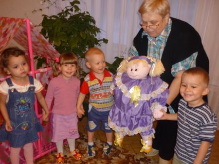 (Воспитатель выносит из домика куклу Машу, она здоровается, благодарит детей за то, что они приехали к ней в гости, спрашивает о том, как живут дети в детском?)