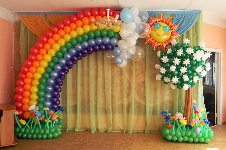 Создать особую неповторимую атмосферу праздника поможет красочное тематическое оформление зала, которое можно создать своими руками, например, разноцветными флажками, надувными шарами, игрушками и детскими рисунками или пригласить специалистов, которые декорируют не только зал, но и уличную площадку.
