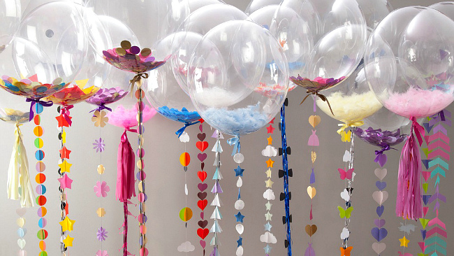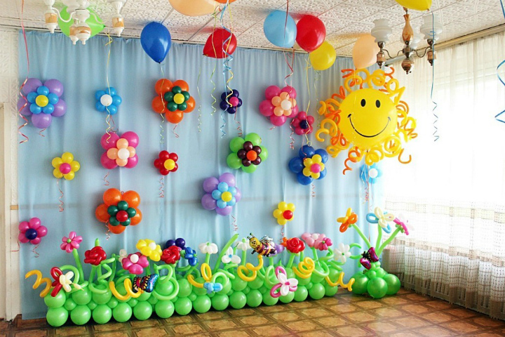 Рекомендую оформить зал с помощью шаров, так в обычном помещении создается атмосфера детства и праздника. А еще можно к каждому шару прикрепить красивую металлизированную ленту, которая эффектно отражает свет. Яркие разноцветные шарики, парящие под потолком, – это невероятно красиво. Как оформить зал шариками с гелием смотрите тут. Материал адресован музыкальным руководителям дошкольных учреждений.