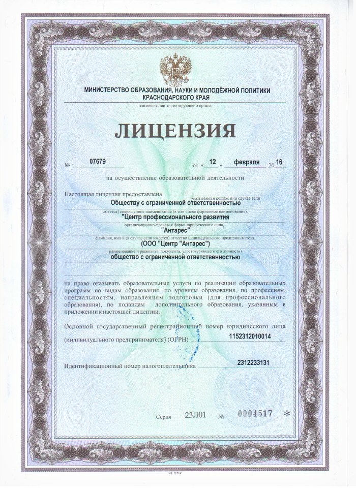 1. Данный учебный центр осуществляет профессиональную переподготовку на базе специальных образовательных программ. Важно учесть, что любой учебный центр, организующий курсы переподготовки на базе высшего образования, должен иметь государственную лицензию на предоставление образовательных услуг. Центр «Антарес» имеет такую лицензию, ее номер можно проверить на сайте федеральной службы в сфере образования и науки.
