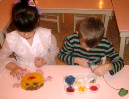 2. Еще один способ создания картин из ниток – мелкое их нарезание и приклеивание к трафарету. Дети с удовольствием работают в парах.