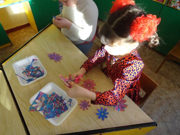 И в итоге получили вот такую пёструю полянку. Цветы посложнее делала сама. Девочки приклеивали на указанное место. А когда стенгазета была уже украшена, приклеивали фотографии мам и подбирали подходящее стихотворение.