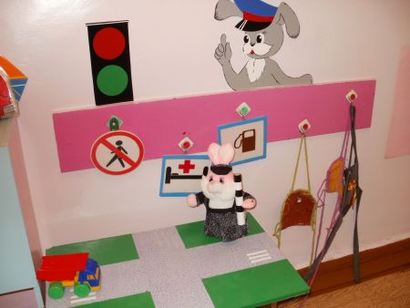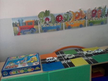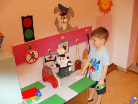 В наше средней группе есть все, что необходимо для обучения и закрепления знаний о ПДД: необходимая адаптированная литература, картотека стихов и загадок о дорожных знаках и транспорте, наборы разрезных картинок по теме «Транспорт», дидактические игры, развивающие внимание и мышление, подвижные, сюжетно-ролевые, театрализованные игры, дорожные знаки. Создан макет дороги, домов, светофор, домик для постового, шлагбаум. В фойе детского сада оформлен макет план - схема микрорайона, где расположен детский сад, с отметкой опасных участков, дорог и пешеходных переходов. Участок возле детского сада оформлен в виде проезжей части: покрашены бордюры, нанесена пешеходная дорожка и дорожная разметка. Именно здесь на прогулках в теплое время года используются самокаты, коляски, а в холодное время санки, ледянки, для того чтобы дети на практике могли отрабатывать навыки безопасного поведения.