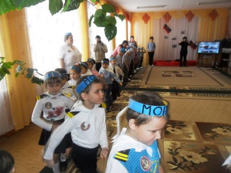 Первая часть праздника проходит в музыкальном зале, где каждая возрастная группа представляла собой определенный род войск. Самые маленькие – барабанщики покоряют всех своей непосредственностью, постарше (от 3- 4 лет) – лётчики очень музыкально и энергично изображают взлётсамолетов, ребята «детсадовского спецназа» показывают свои артистические способности и четкость выполнения задания, моряки – перестроение в две колонны, как истинный ВМФ, десантники очень задорно исполняют оригинальную песню.