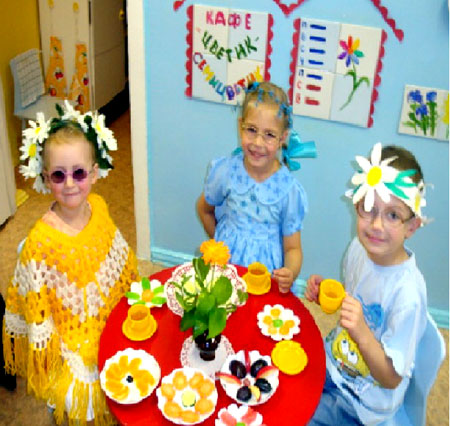 Воспитатель: Вы хотите, чтобы лето не кончалось? Почему бы вам не провести вечер в летнем кафе. Мы приглашаем вас в Разноцветное кафе «Семицветик».