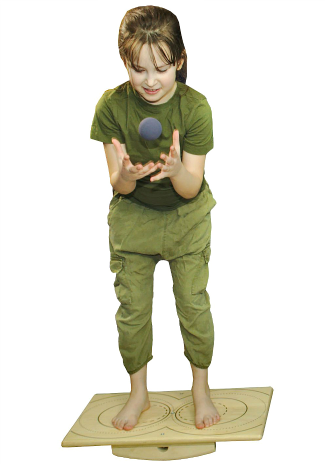 Когда первые навыки жонглирования закрепятся, можно усложнить задачу с помощью балансировочной доски. Это одно из самых эффективных средств мозжечковой стимуляции, позволяющих скорректировать нарушения координации движений, стимулировать развитие умственной и письменной речи.