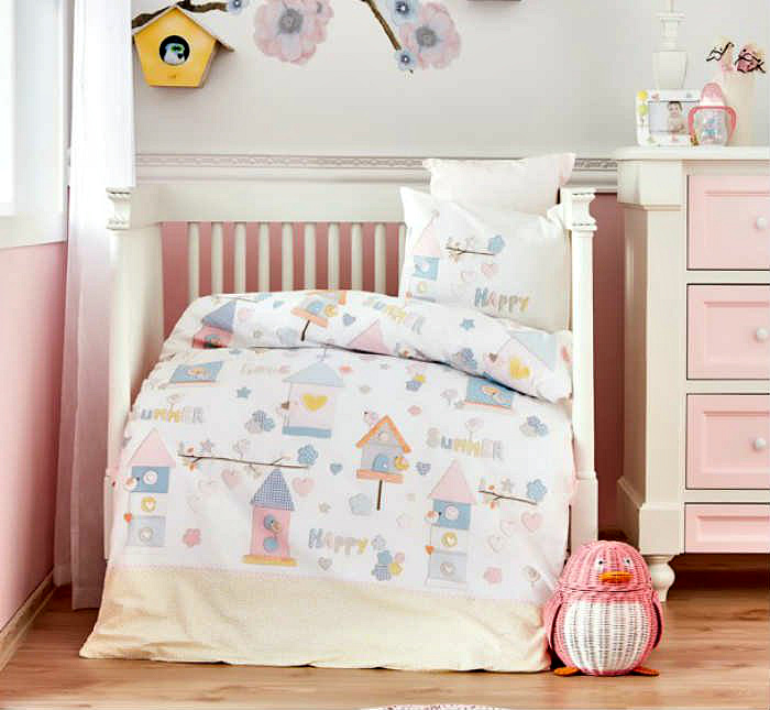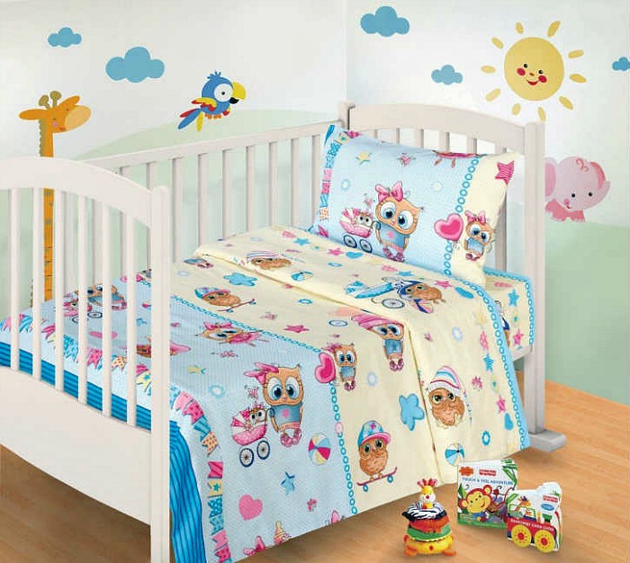 Относительно расцветки, лучше всего остановиться на постельных тонах с симпатичными рисунками. Они будут действовать успокаивающе. Для девочек – нежно-розовый комплект с нарисованными плюшевыми мишками. Либо модель персикового цвета с абстракцией. Мальчику можно подобрать морской дизайн. Или же изображение ночного неба со звездами…