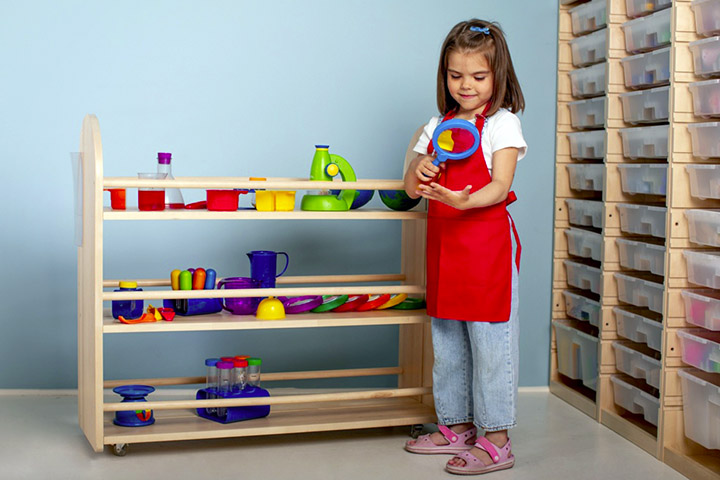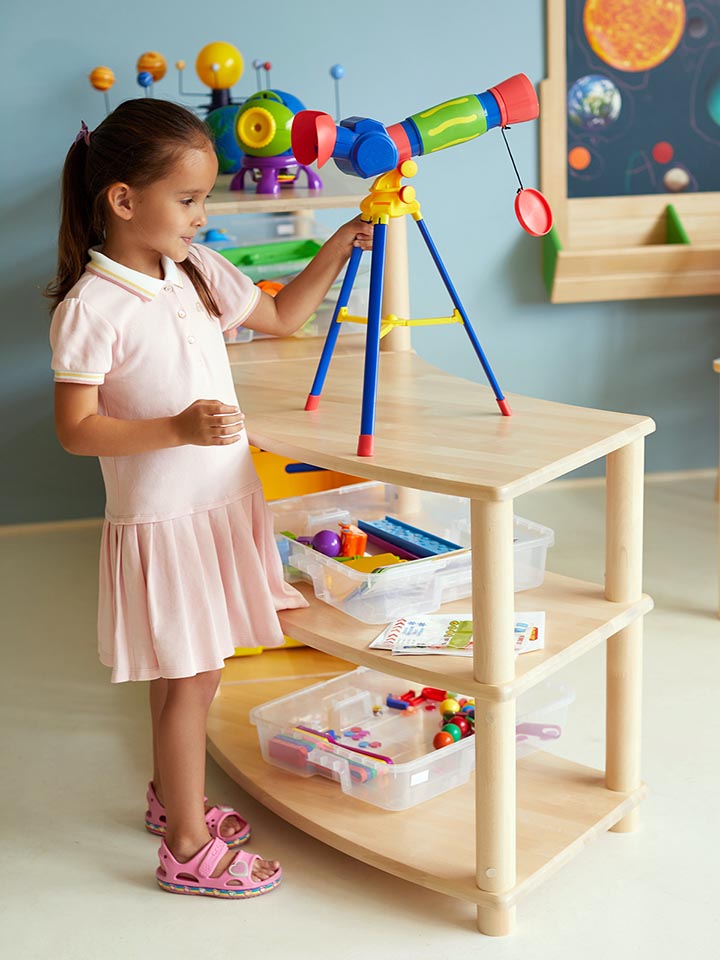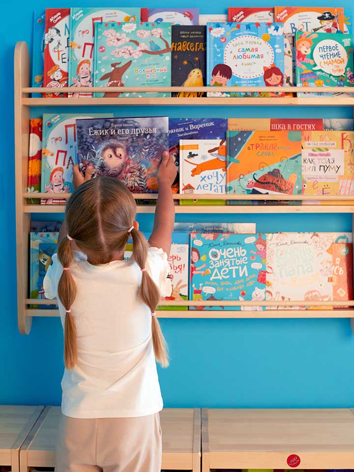 открытые стеллажи и полки, к которым малыши могут дотянуться самостоятельно, тренируя самостоятельность и мелкую моторику.
